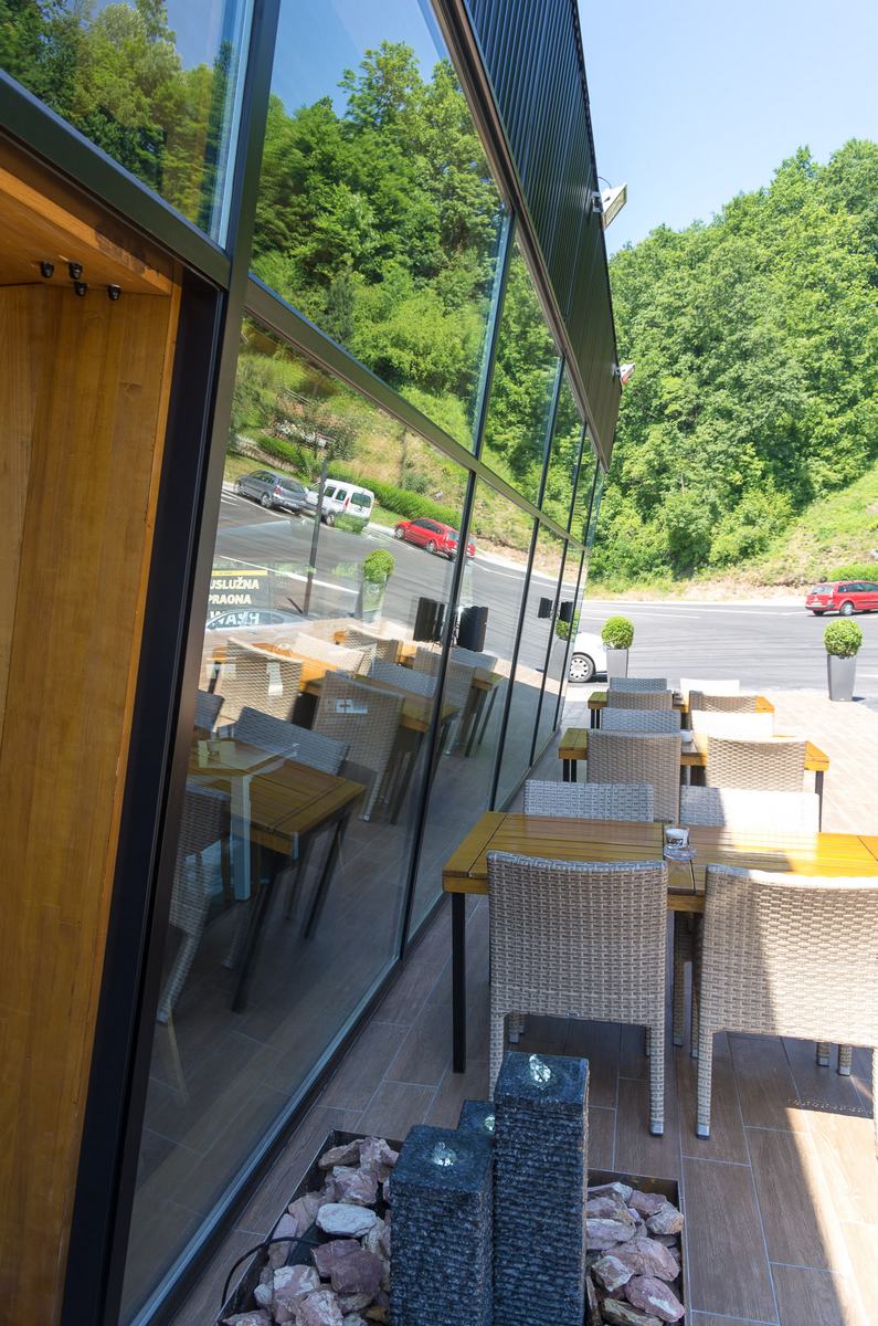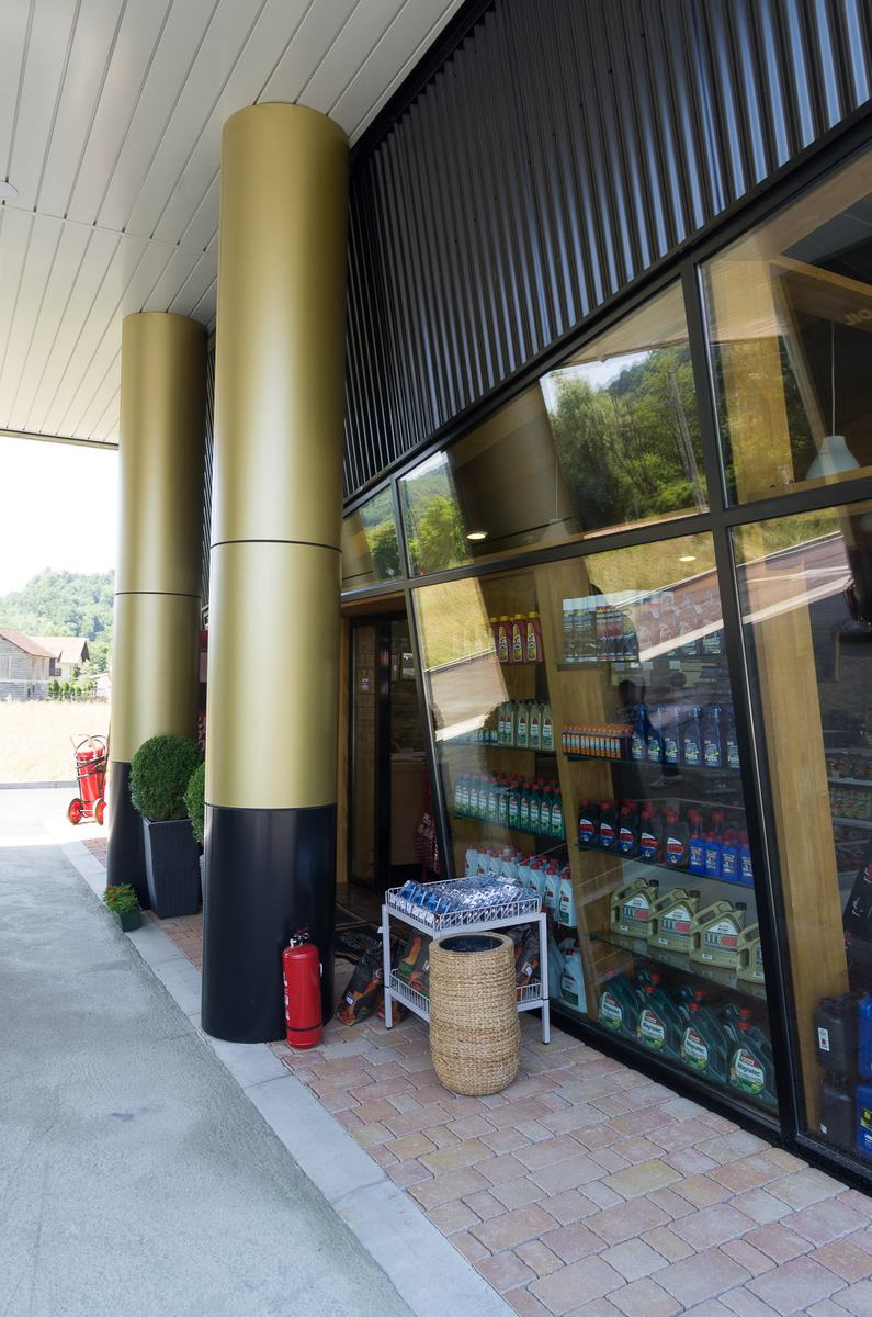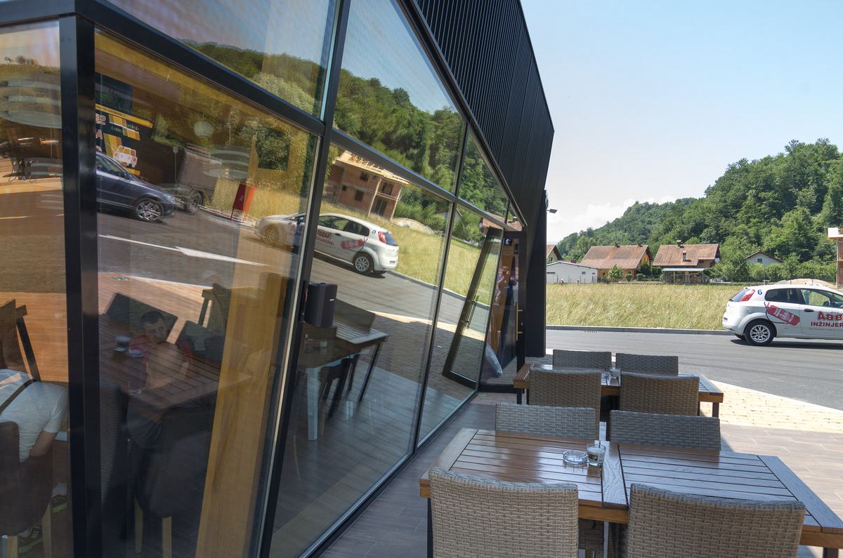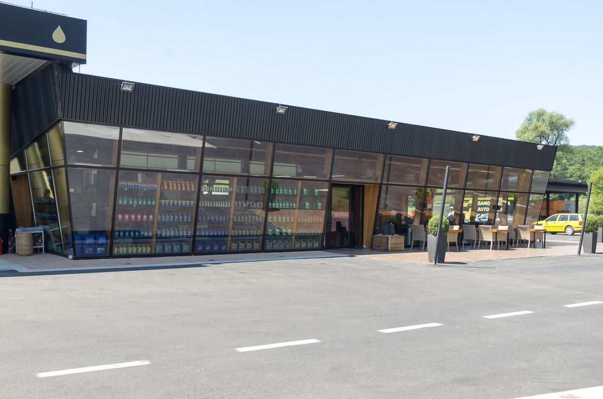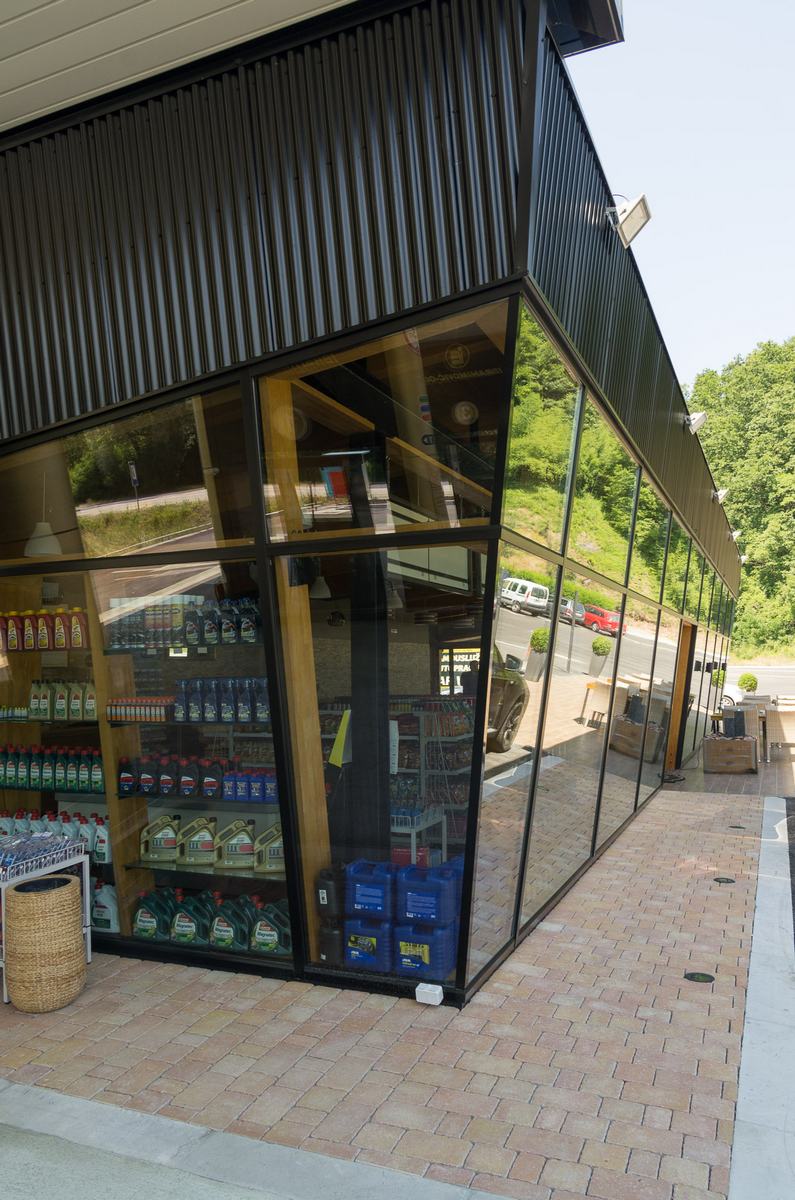 Benzinska pumpa Ibrahimović, odličan primjer uklapanja ALU elemenata i velikih staklenih površina sa unutrašnjošću od drvenih elemenata.