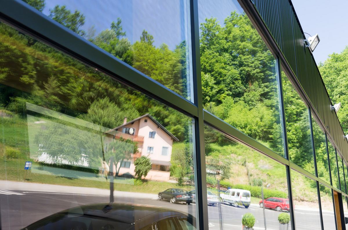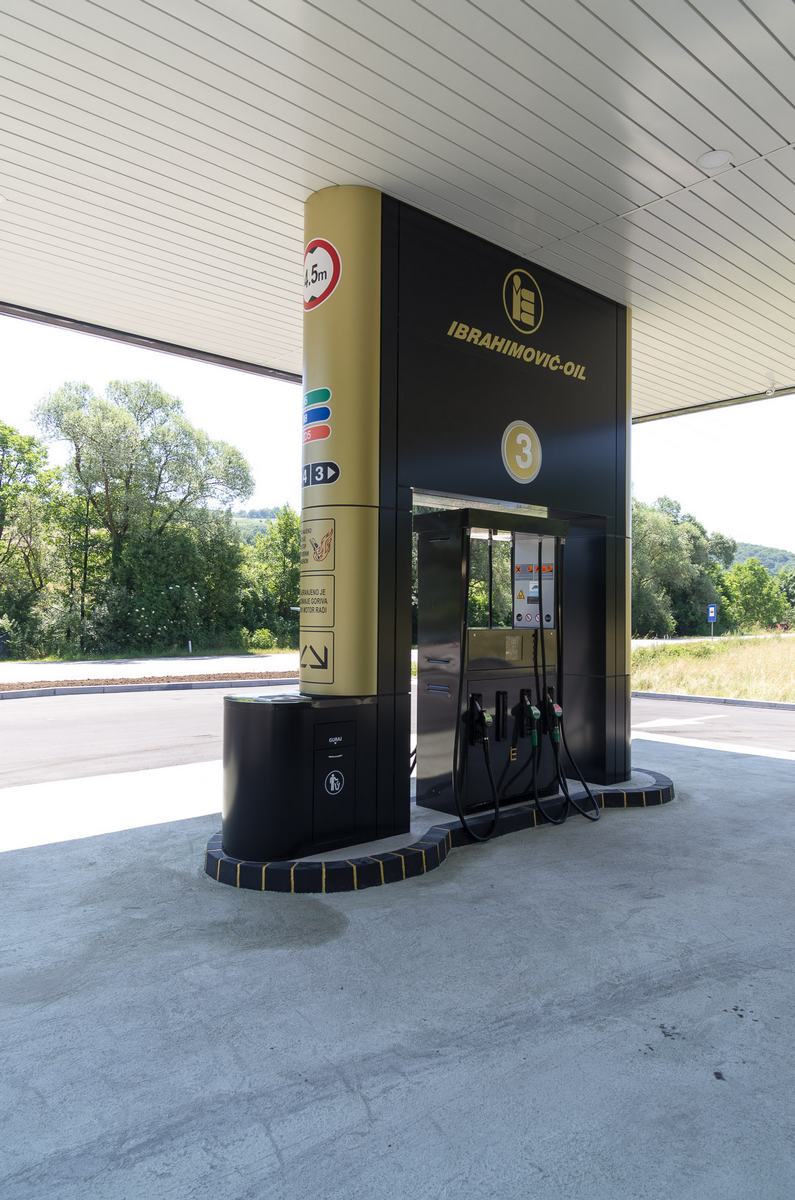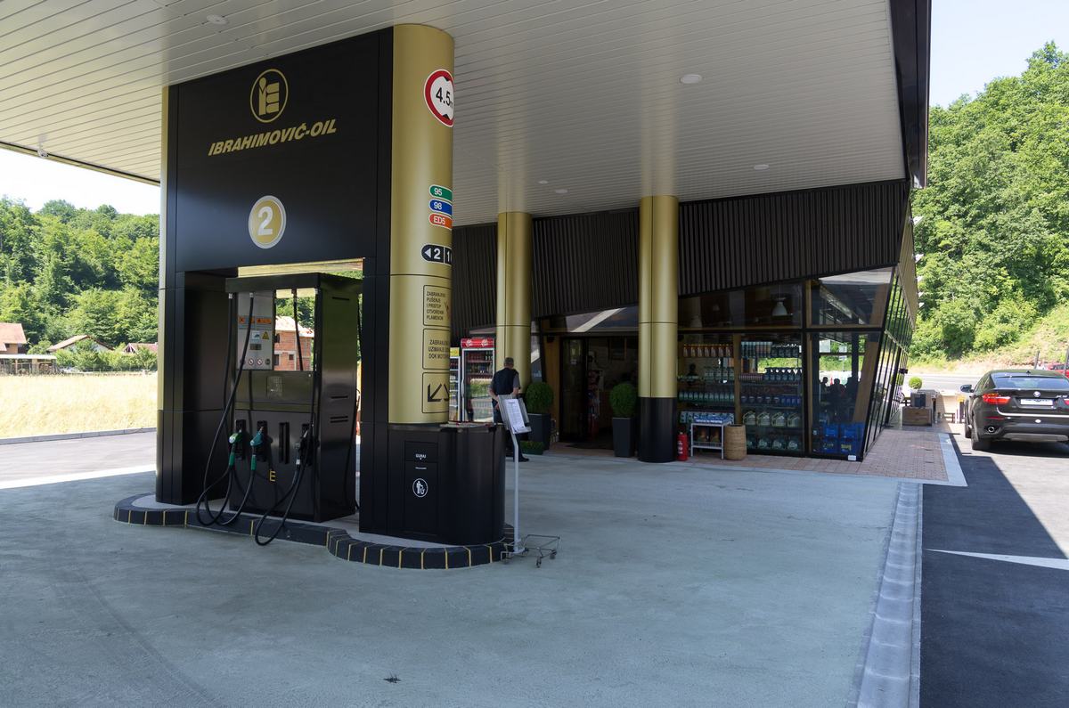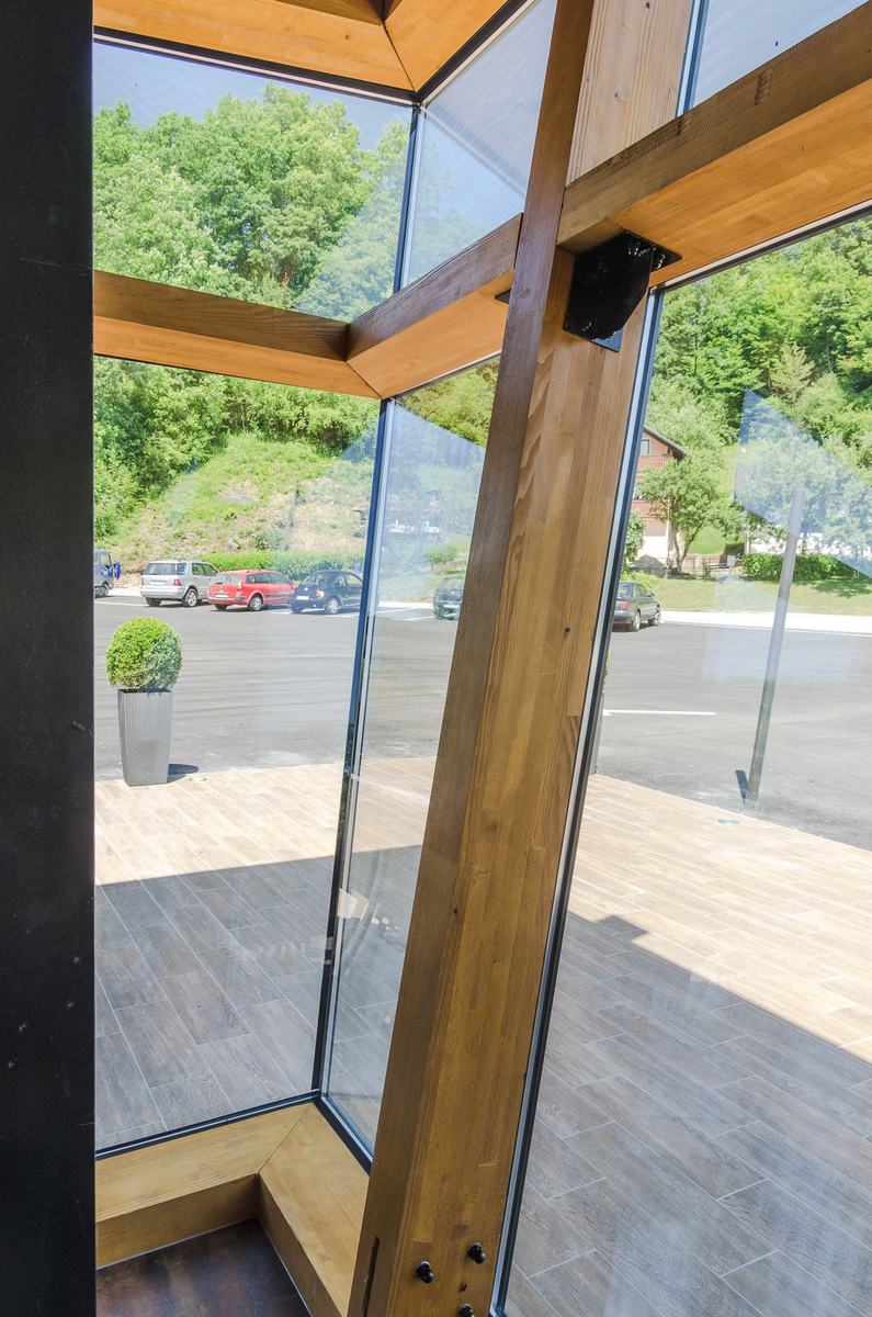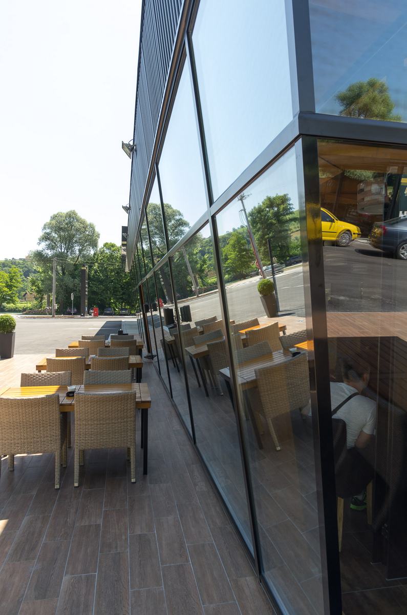 Benzinska pumpa Ibrahimović, odličan primjer uklapanja ALU elemenata i velikih staklenih površina sa unutrašnjošću od drvenih elemenata.